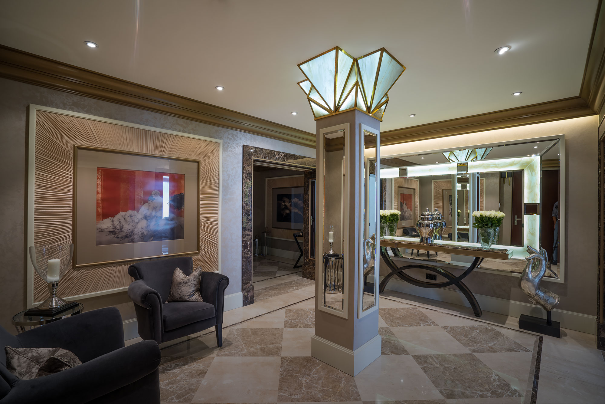 В сотрудничестве с одними из лучших мастеров в мире были изготовлены предметы интерьера из дерева, уникальные канделябры, мебель и драпировки для всех помещений на объекте.